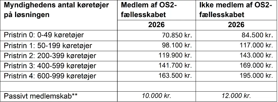 Prisen for at blive en del af OS2FleetOptimiser-fællesskabet afhænger af antallet af køretøjer I ønsker at kunne simulere på. Det årlige vederlag dækker alt fra hosting, supportaftale, vedligehold og løbende compliance til udviklingsmidler, bidrag til drift af produktsekretariat og finansieringsbidrag til OS2's fælles sekretariat. Alle priser er opgivet pr. år ekskl. moms. Priserne justeres hvert år.